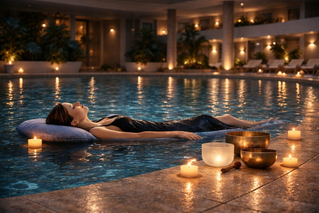 A víz megtartó ereje segít elengedni a test feszültségeit, miközben a hangok lágyan vezetik az elmét a csend felé.